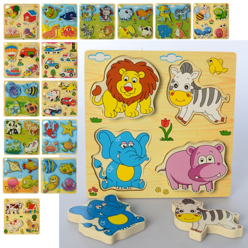 Деревянная игрушка Рамка-вкладыш MD 2651 (100шт) транспорт/животные, 16видов, в кульке,14,5-15-1см