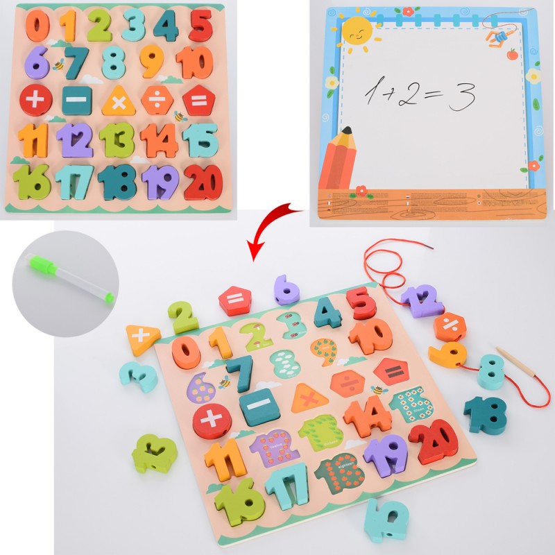 Деревянная игрушка Рамка-вкладыш MD 1844 (20шт) 3в1(досточ/шнур),цифры,мат.знаки,в кульке,30-30-2см