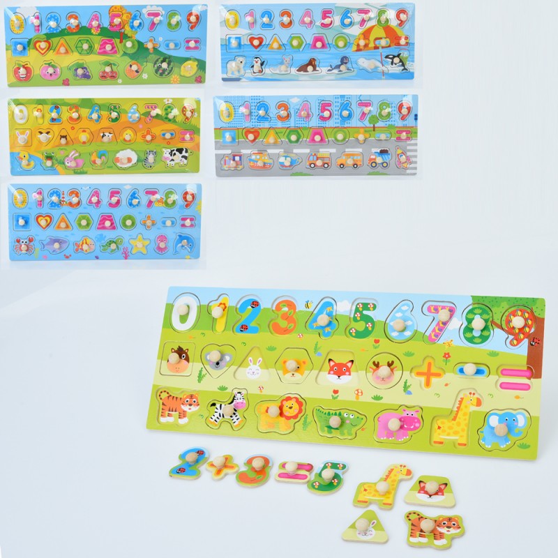 Дерев'яна іграшка Рамка-вкладиш MD 1537 (30шт) з ручкою, цифри, фігури, 6 видів(тварини, морські мешканці, фрукти,транспорт), у пакеті, 45-18-2см