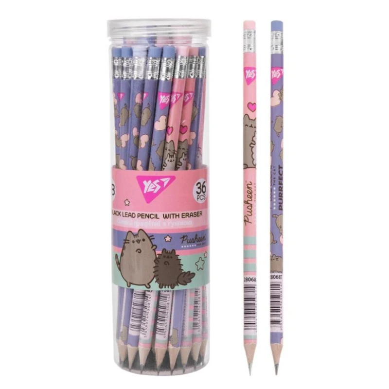 Олівець Yes ч/гр круг. з ласт. у пл. тубе, 36шт/уп "Pusheen" 2 диз. мікс