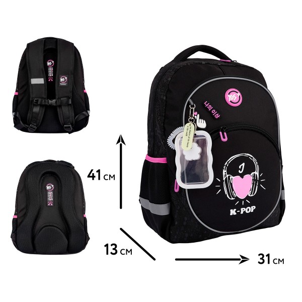 - ортопедична спинка з пом’якшувальними подушечками для правильного положення тіла та комфорту під час носіння;- анатомічні S-подібної форми ущільнені лямки для зниження навантаження на плечі;- основна текстильна ручка;- 2 містких відділення для підручників та зошитів;- 1 простора передня кишеня для шкільного приладдя, пеналу та інших речей невеликого розміру;- 2 бокові кишені для пляшечки з водою та інших дрібних речей;- надійна фурнітура для довговічності;- світловідбивальні елементи для безпеки;