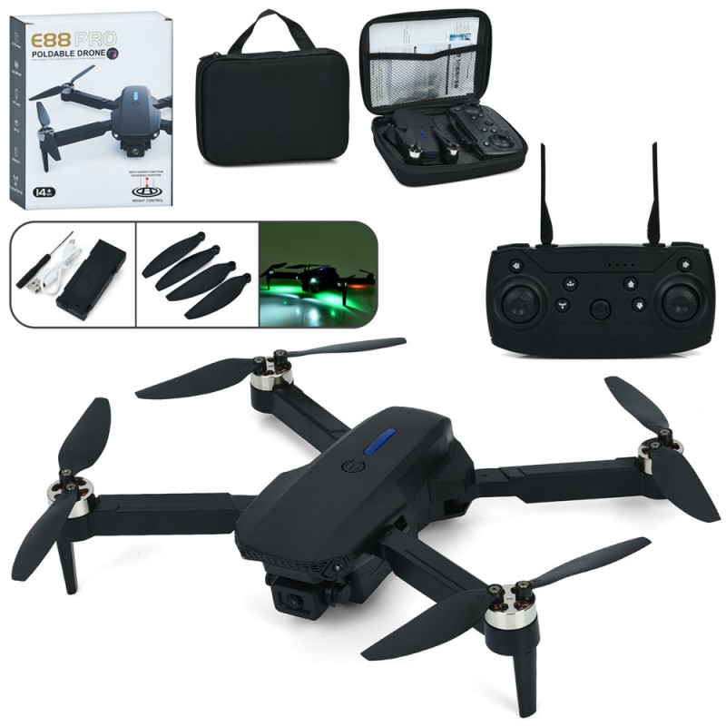 Квадрокоптер E88-4 (12шт) р/к2,4G, акум, 35см, камера, складний, світло, USBзарядне, запасні лопаті, чохол, в кор-ці, 17,5-22-6,5см