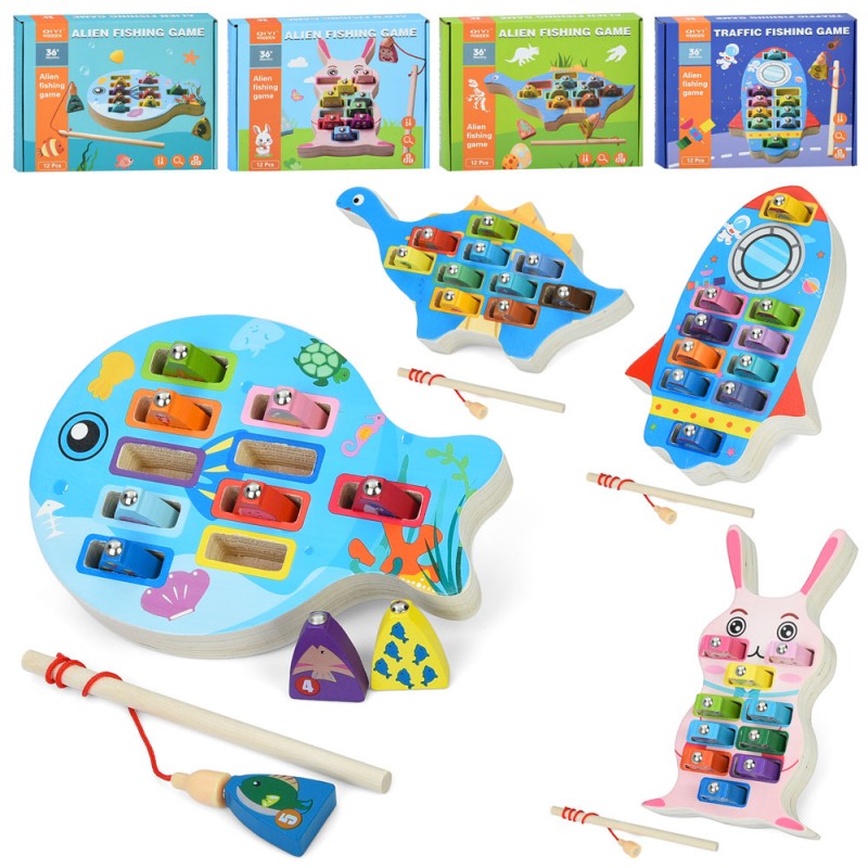 Дерев'яна іграшка Риболовля MD 1366 (30шт) магнитна, ігрове поле, 1 вудка, фігурки 10шт, 4 види, в кор-ці, 21,5-17-3,5см