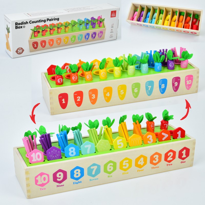 Дерев'яна іграшка Центр розвиваючий MD 0736 город(морква-різнокольор.з цифр.),палички для лічби,кор.