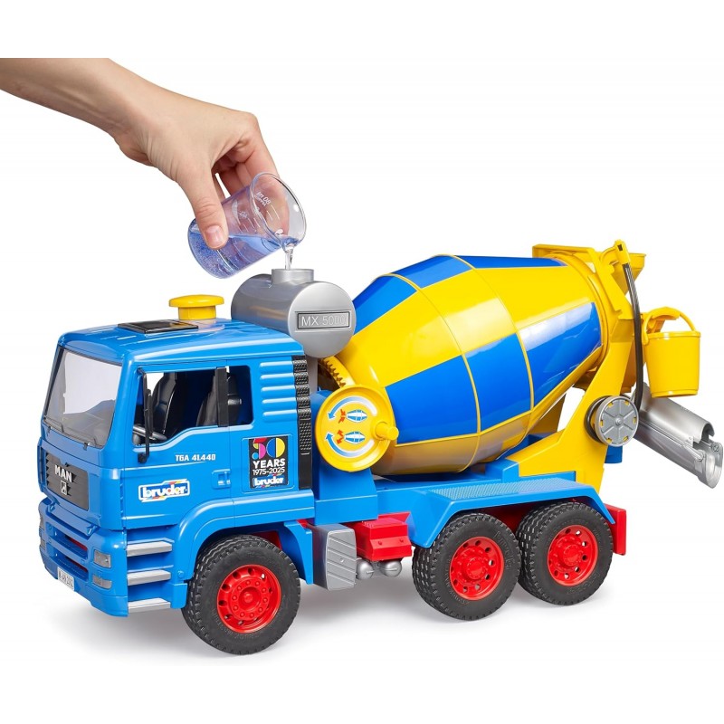 Машинка іграшкова. Бетонозмішувач MAN TGA лімітована серія "50 років Bruder": Лімітована колекційна модель бетонозмішувача на шасі MAN TGA. Функціональна іграшка, яка дозволяє імітувати замішування та доставку будівельних матеріалів.