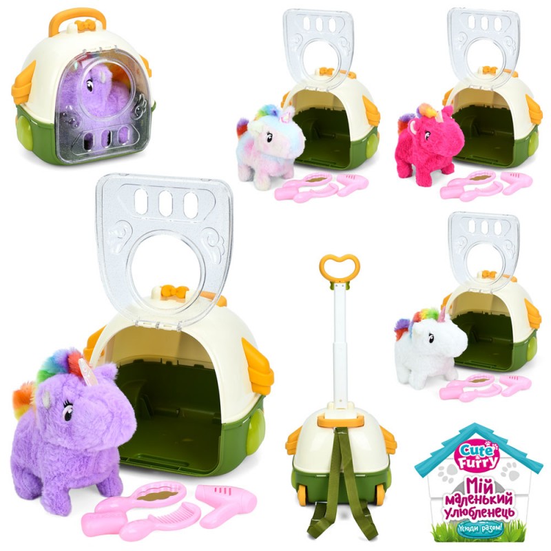 Конячка 777-114D (24шт) 18см, ходить, звук, рухливий хвіст, плюш, набір грумера, 4 види, рюкзак (2колеса,ручка), пакет, 21-20-17см