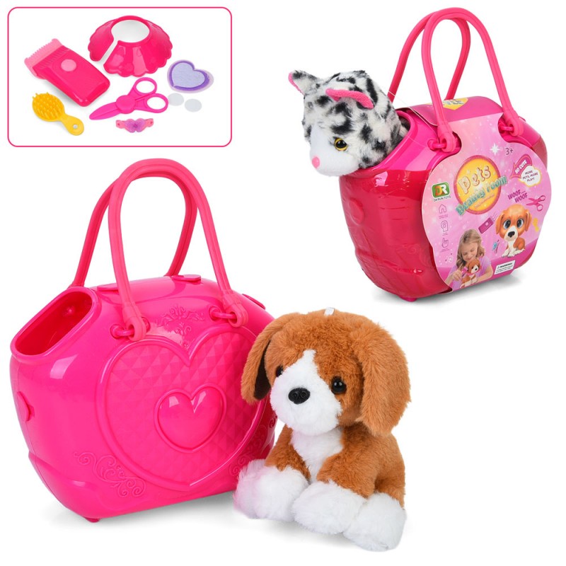 Тварина DR5126-27 м'яка іграшка,наб.грумера,сумка(пласт.),2види(собака,кіт),карт.обгортка,23-22-10см