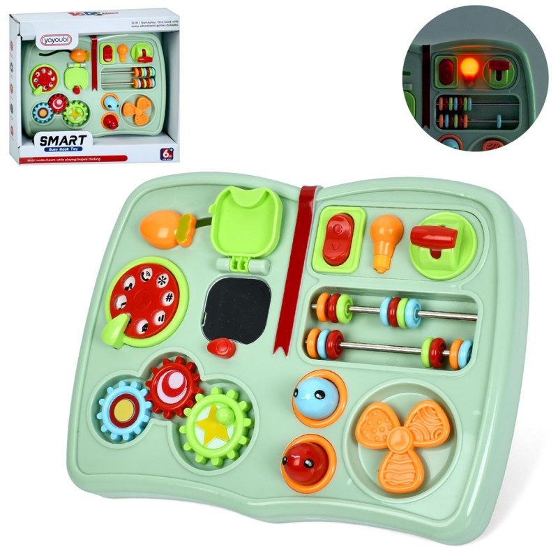 Гра 221 (30шт) бізіборд, 10в1, звук, світло, шестерні, дзеркало, спінер, вмикач, важіль, 2режими гучності,на бат-ці, в кор-ці, 25-22,5-6см