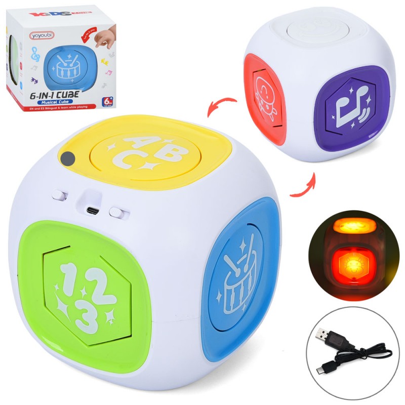 Гра 211 музичний куб, 6в1, навчальний (літери, цифри,муз.),USB,акум.,муз.,світло,кор.,16,5-16-17см.