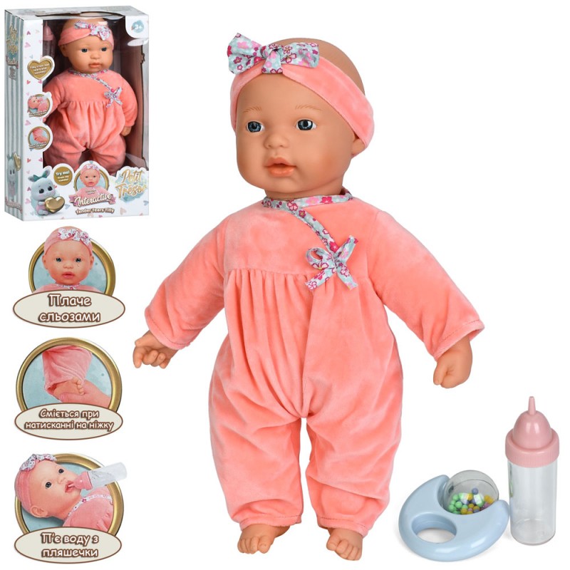 Лялька 16390 пупс, м'яконабивна,інтерактивна,плаче(сльози),пляшечка,брязкальце,муз.,бат.,кор.,26-41