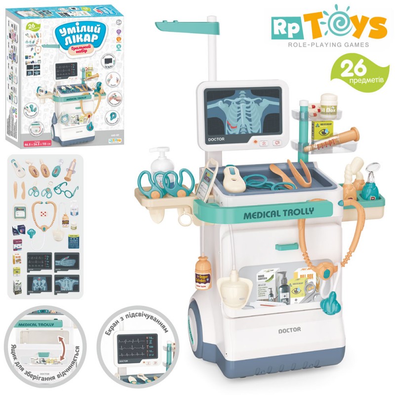 Набір лікаря 660-90 (12шт) стіл-возик, 46,5-26,5-в115см, рентген, стетоскоп, мед.інструменти, звук, світло, 26пр, на бат-ці, в кор-ці, 46-38-12,5см