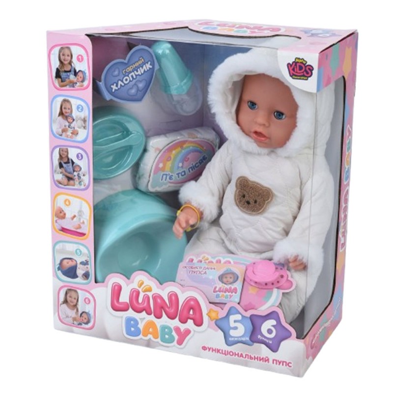 Лялька AKG-0007 пупс, п'є-пісяє, горщик, пляшечка, соска, підгузок, посуд, кор., 33-38-18 см.