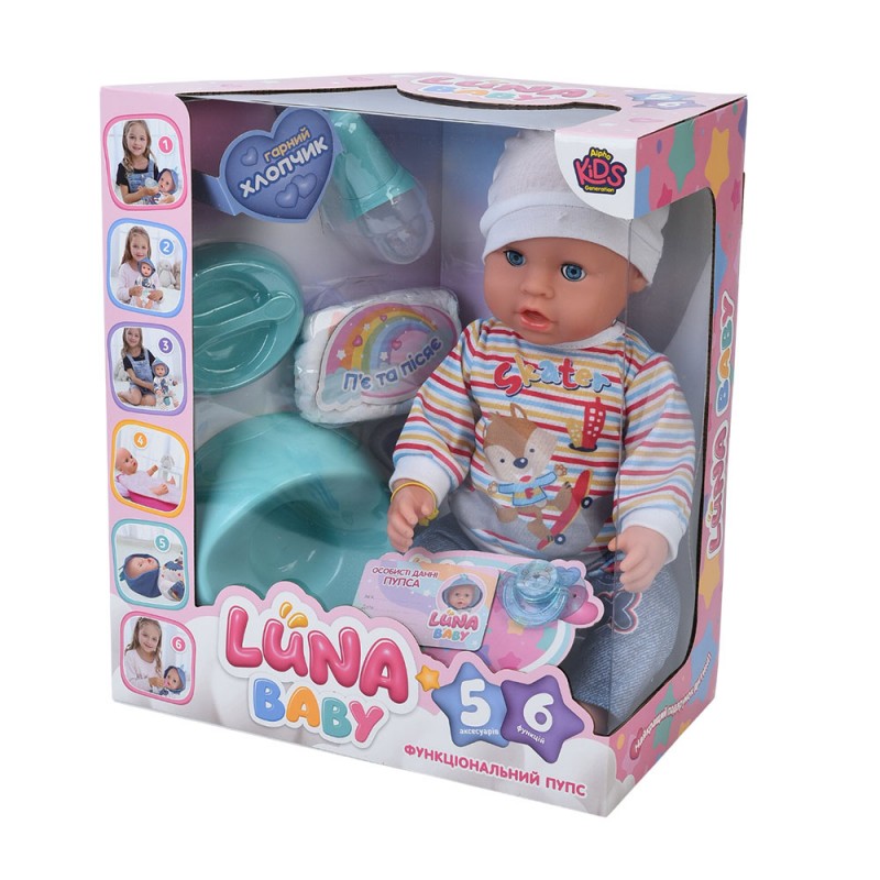 Лялька AKG-0008 пупс, п'є-пісяє, горщик, пляшечка, соска, підгузок, посуд, кор., 33-38-18 см.
