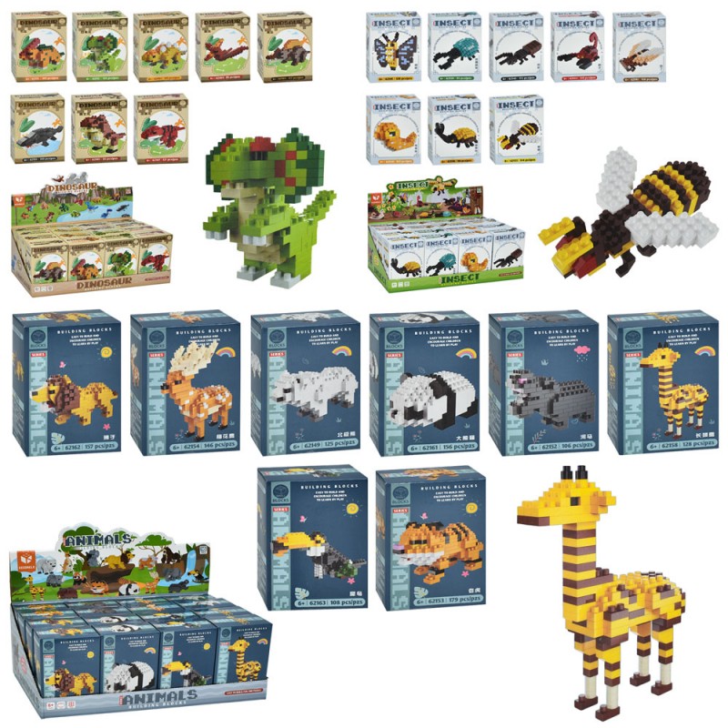 Конструктор A621-1-3-4 (320шт) від 90дет, в кор-ці, 3види дисплеїв (динозаври,комахи, тварини), 16шт(8видів) в дисплеї, 32-12-17см 1ЯЩИК-1ВИД