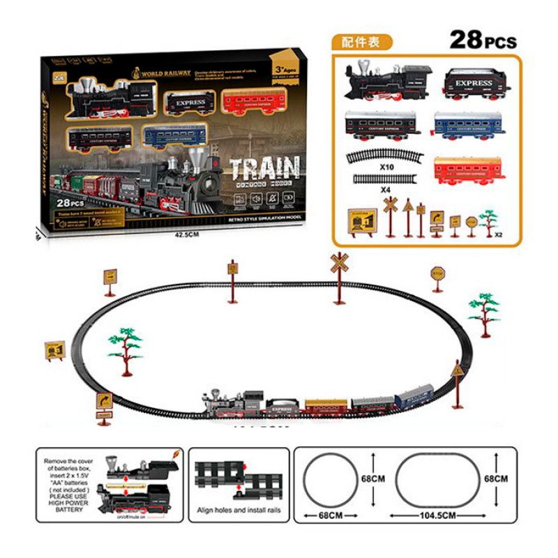 Залізниця 9299-87 (24шт) 104,5-68см, локомотив, вагони 4шт, звук, 28дет, на бат-ці, в кор-ці, 42,5-27-5см