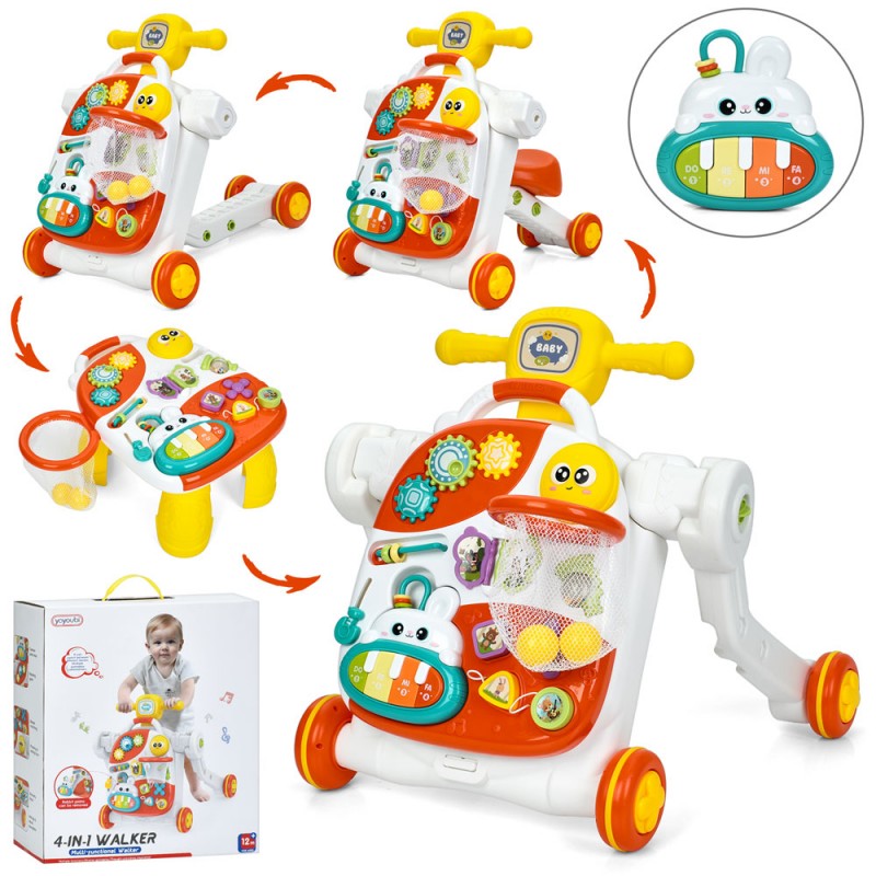 Каталка-ходунки 219 (8шт) 4в1(толокар, столик), ігрова панель(піаніно-муз, шестерні,баскетбольне кільце), на бат-ці, в кор-ці, 40-46-17см