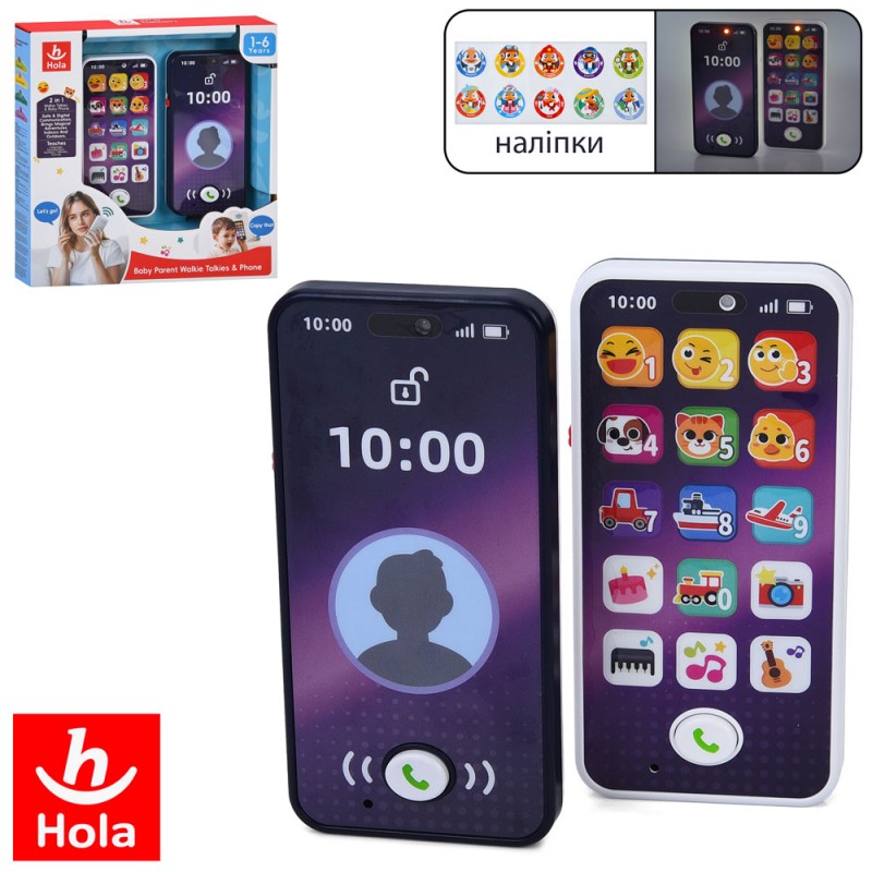 Рація HE8965 (9шт) 2шт, 2в1 (рація, телефон), 14-7см, музика, звук(англ), світло,2 режими гучності, наліпки, на бат-ці, в кор-ці, 22-22-4,5см