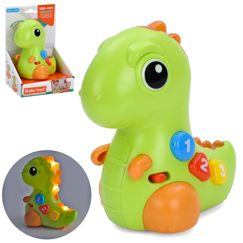 Музична іграшка 6802 динозавр,15см, муз.,звук,світло,колеса,2 реж. гуч.,на бат.,в кор.і,14-20,5-10см