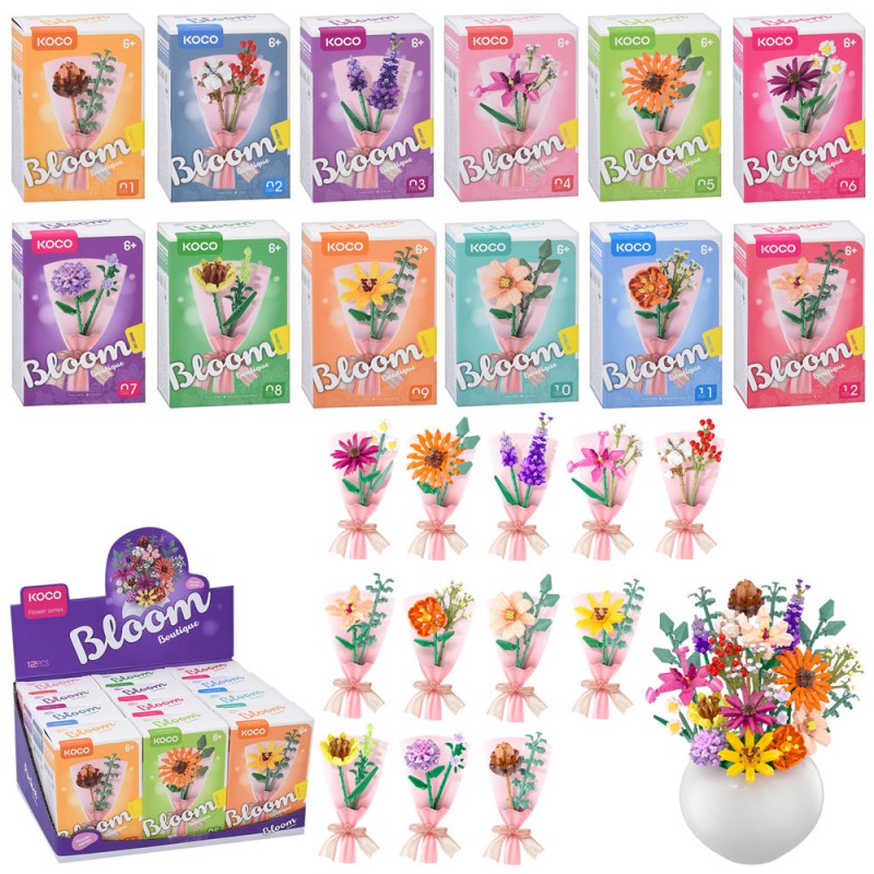 Конструктор 01025-36 квіти, букет, від 128дет, в кор-ці, 12шт(12видів) в дисплеї, 25-13-17см