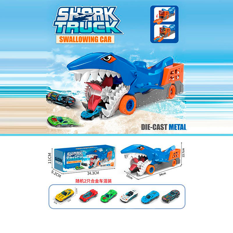 Трейлер 3303-1 (24шт) 34см, 2в1(трек), корпус акула,гумові колеса 2шт, машина (2шт, метал, 7см), в кор-ці, 33-13,5-11,5см