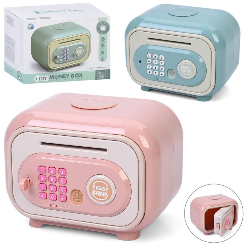 Скарбничка MK 5727 сейф з кодом, 9-14-13см, ключ,затягує купюри,музика,звук,2 кольори,на бат.,в кор.