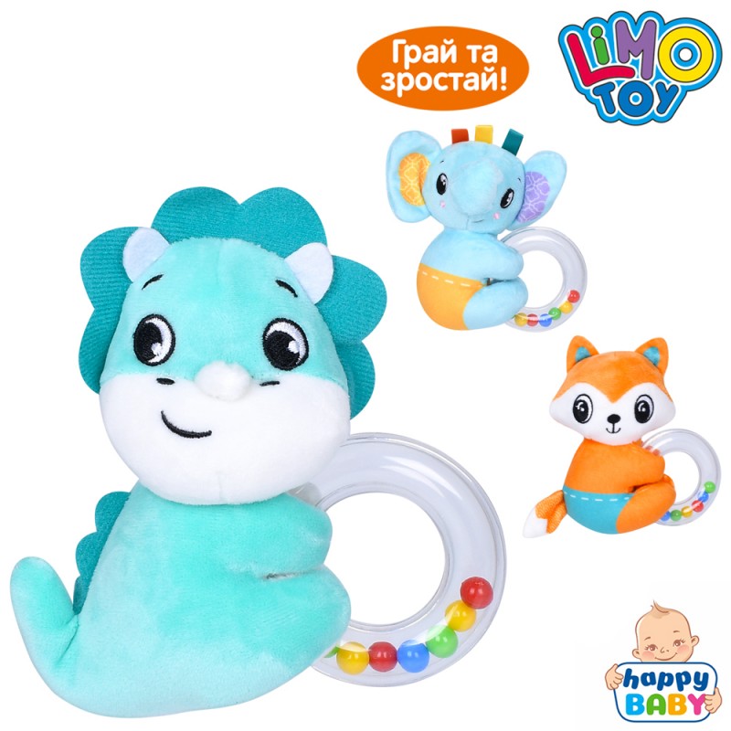 Брязкальце м'яке HB 0060 ABC (75шт) 12см, пискавка, плюш, 3 види (лисичка, динозавр, слон), у пакеті, 11-14-5см