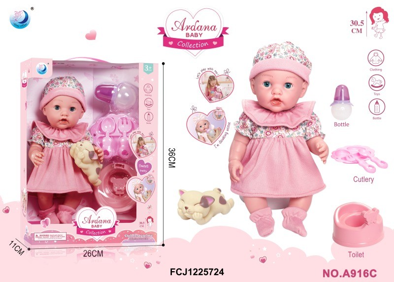 Пупс AKG-0053 п'є-пісяє, горщик, пляшечка, посуд, кіт, кор., 26-36-11 см.