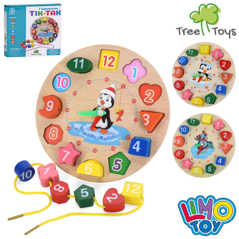 Дерев'яна іграшка Годинник MD 0766 рамка-вкладиш,фігури-цифри,шнурівка,3 види,в кор,18-17,5-2,5см