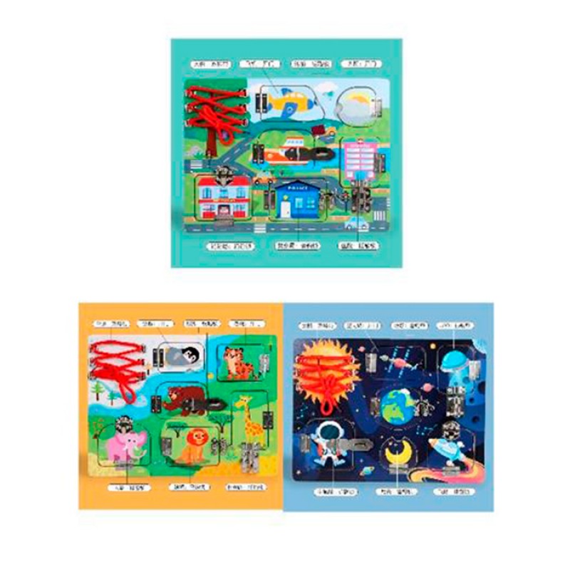 Дерев'яна іграшка Бізіборд MD 0146 (18шт) ігрове поле 30-22,5см, шнурівка, замки/засуви, рухливі деталі, 3 види, у кор-ці, 31-23,5-2,5см