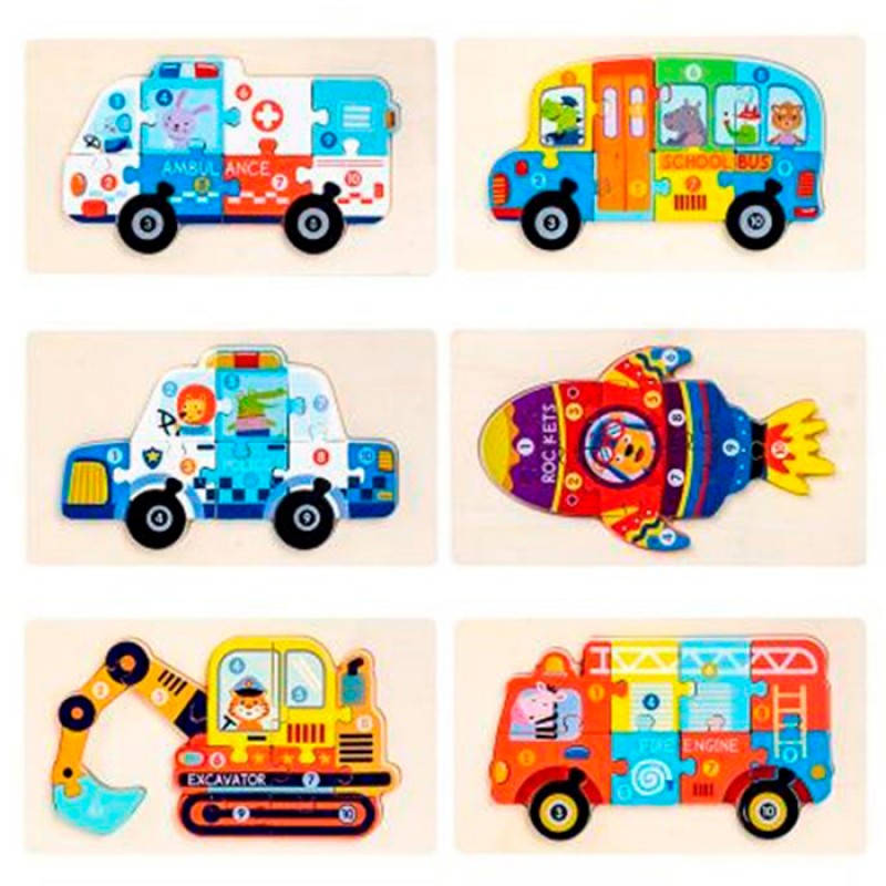 Дерев'яна іграшка Пазли MD 0768 10дет, транспорт, назви англ., 6 видів, у пакеті, 22-13-1см