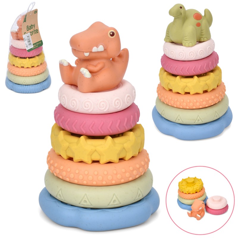 Пірамідка 638-116 (30шт) 17см, динозавр, 6 кілець(текстурні, пазли), 2 види, в сітці, 21-10-10см
