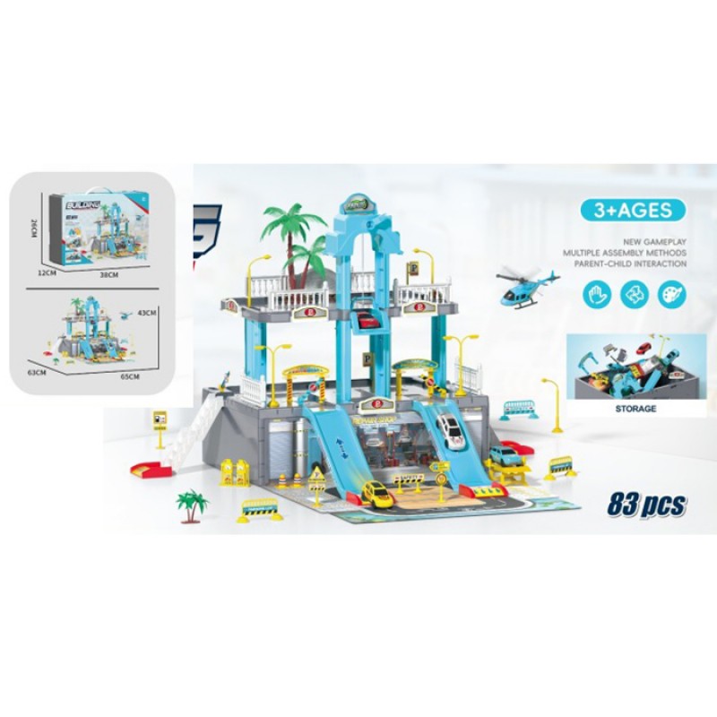 Гараж A246 (9шт) 65-63-в43см, 2 поверхи, ліфт, машинки, 83дет, складається в чемодан (пластик+картон), пакет, 37,5-26,5-12см