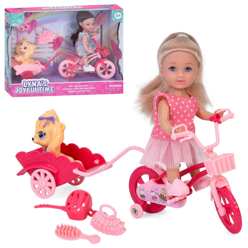 Лялька 3806 11см, шарнірні ноги, велосипед з возиком, собака 5см, аксесуари, 2 види, в кор-ці