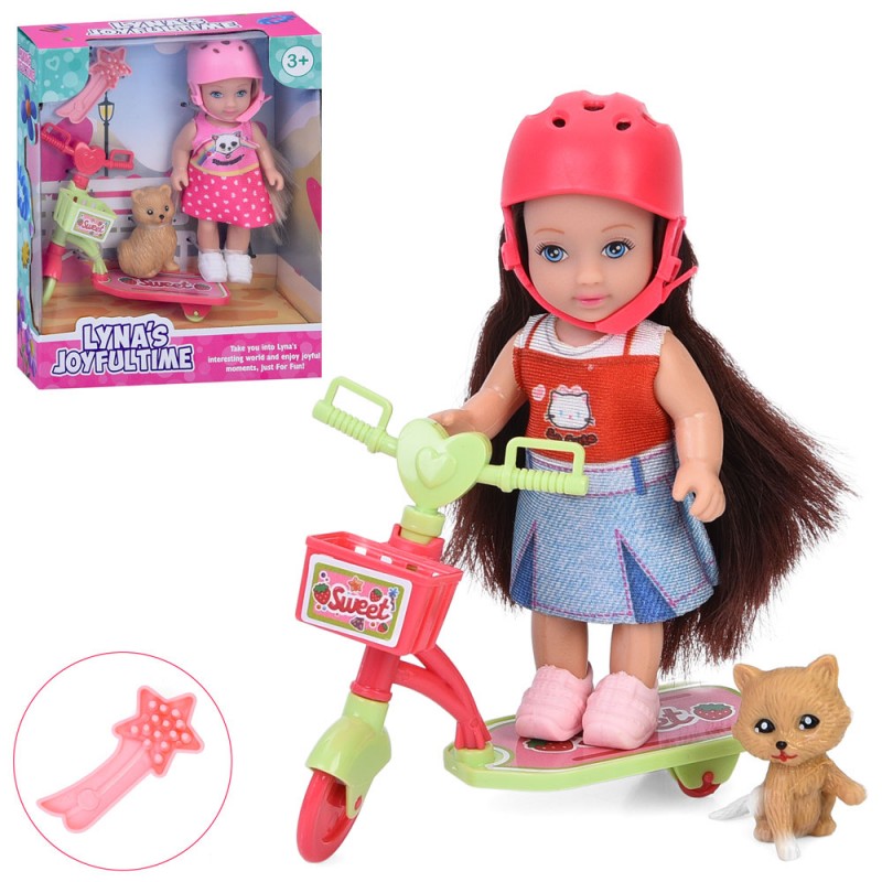 Лялька 3804 11см, самокат, тварина 3,5см, гребінець, 2 види, в кор-ці, 13,5-16-4,5см