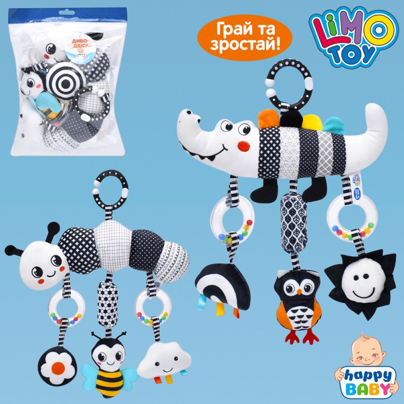 Підвіска м'яка HB 0064 AB (36шт) на коляску/на ліжко, 35см, звук, пискавка, брязкальце, плюш, 2 види (крокодил, гусениця), у пакеті, 18-25-5см