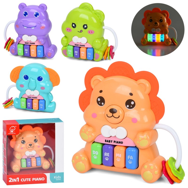 Піаніно 1012-13-14-15 (32шт) тварина, 11-12-4,5см, 2в1(брязкальце), музика, звук, звуки тварин, світло, 4 види, на бат-ці, в кор-ці, 15,5-17-6см