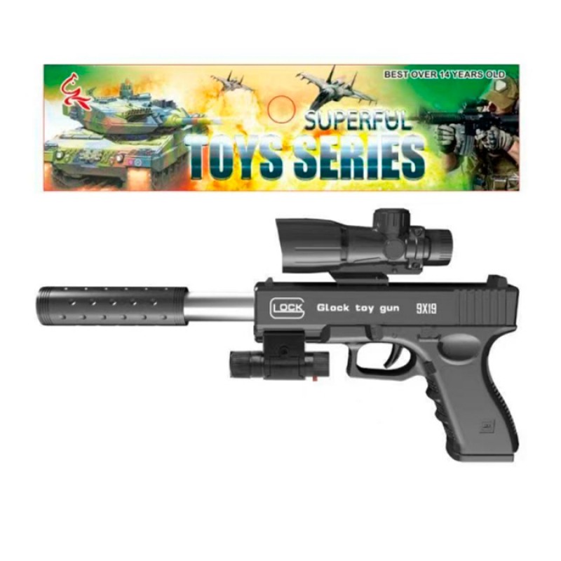 Пістолет 03-1+ (48шт) 32см, пластикові кулі, лазер, на бат(табл), у пакеті, 15-23-3см