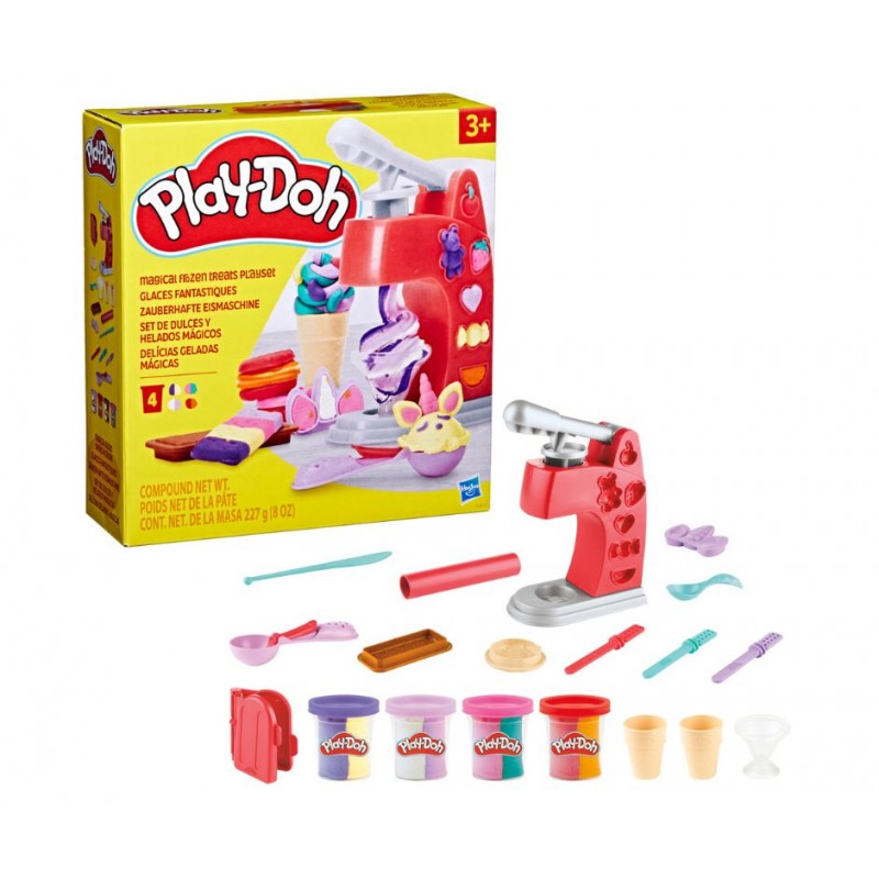 Креативний набір із нетоксичною масою для ліплення (імовірно, Play-Doh, позначений як PD). Набір містить формочки, преси та аксесуари (наприклад, ріжки, тарілочки), необхідні для створення різноманітних видів "морозива". Стимулює рольову гру та розвиває дрібну моторику.