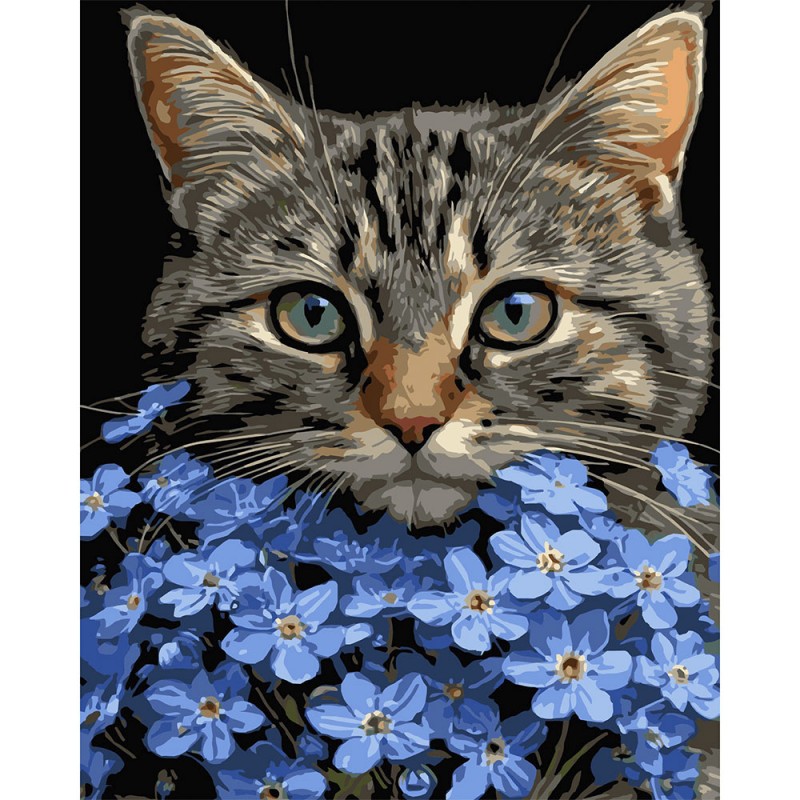 Картина за номерами Strateg Кіт серед блакитних квітів на чорному фоні 40Х50 (AH1273)