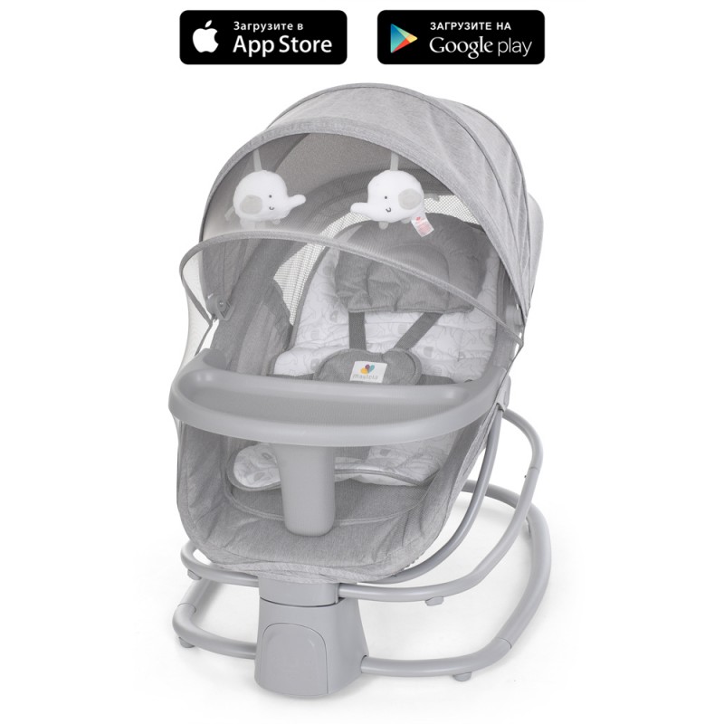 Заколисуючий центр-шезлонг 8085 2в1, APP, USB, таймер, москіт. сітка,столик, муз, світло-сір.