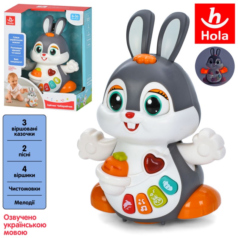 Гра HE9991 UA (12шт) Зайчик Чеберяйчик, 19см, музика-звук(УКР), 4 віршики, 2 пісні, 3 віршовані казочкм, чистомовки, фрази, мелодії, світло, їздить/танцює, рухає лапами, кліпає очима, 2 режими гучності, на бат-ці, в кор-ці, 18-23,5-12,5см