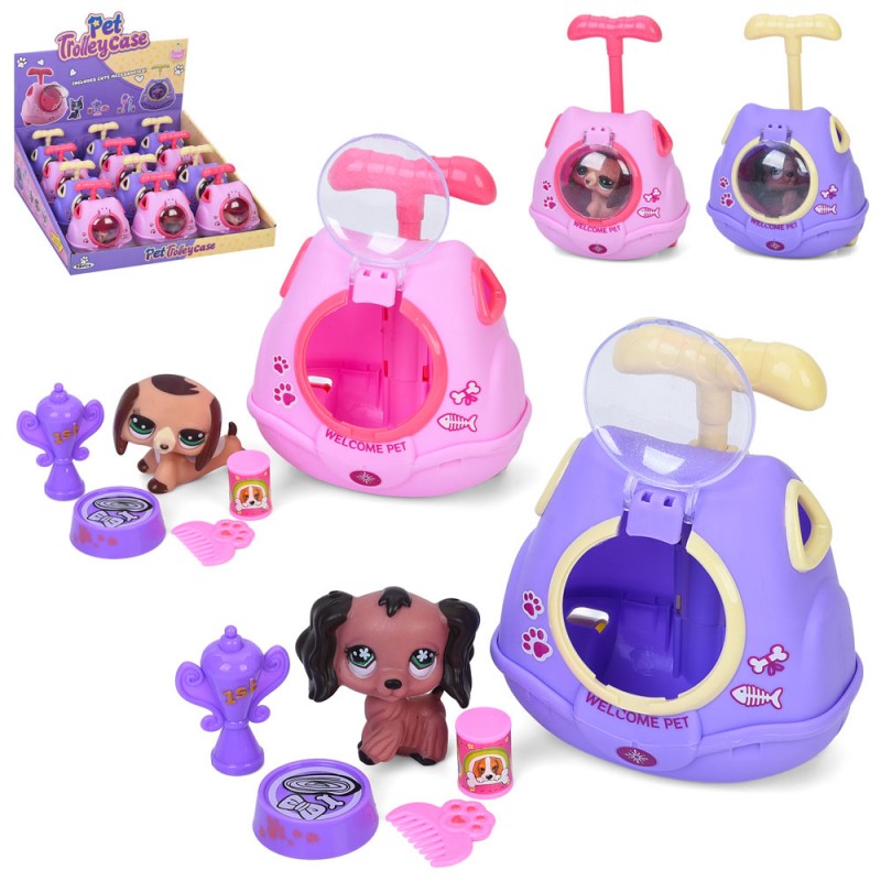 Тварина в переносці CL21195-8 (60шт) собака, 3 види собак 6см, аксесуари (сюрприз), 2 кольори переносок 13-12-8см, 12шт(3види) в дисплеї, 39-35-13см