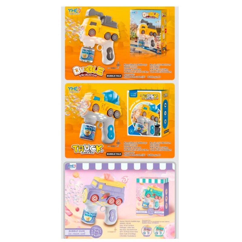 Мильні бульбашки 333-35-36-38 (18шт) пістолет (транспорт), 19см, світло, запаска 7см, (автобус, 2 види-будтехніка), на бат-ці, в кор-ці, 15-20-7,5см