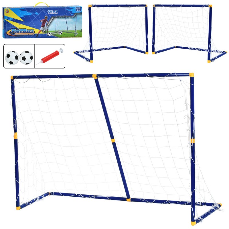 Футбольні ворота MR 1534 (12шт) 2в1 (1шт 138-45,5-в100см, 2шт 73,5-45,5-в55,5см), сітка 3шт, насос, м'яч 2шт,в кор-ці, 66-25-5см