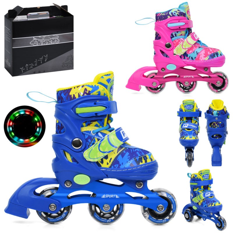 Ролики A4160-XS (6шт) розсувні, шнурівка+бакля, алюм.рама, 3 колеса ПВХ 61мм, 1світло, устілка 15см (+2,5см), комбо, 2 кольори, в кор-ці, 29-26-10,5см