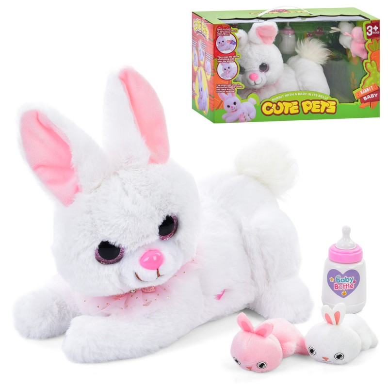 Тварина 933-146E (12шт) зайчик, 24см, музика(англ), звук, сенсор, запис, реагує на зайчат(2шт) та на пляшечку, на бат-ці, в кор-ці, 36-21-20см