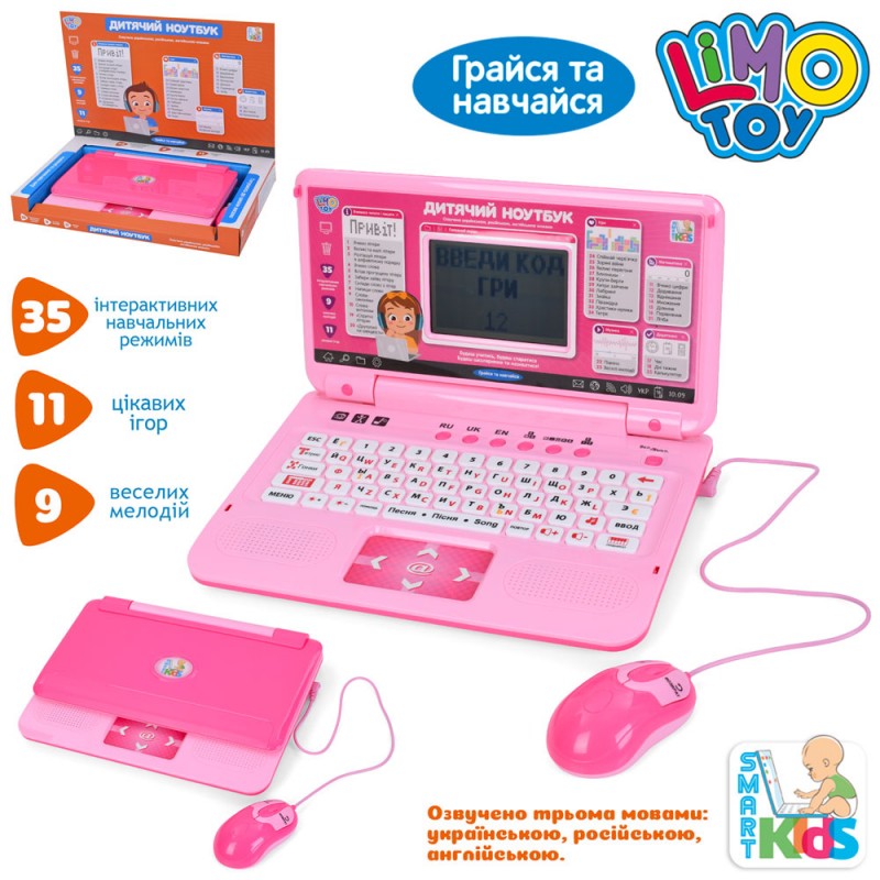 Ноутбук SK 7443 навчальний (алфавіт,матем.вправи,логіка),муз.,35функ,11ігор,мишка,рожевий колір,кор.