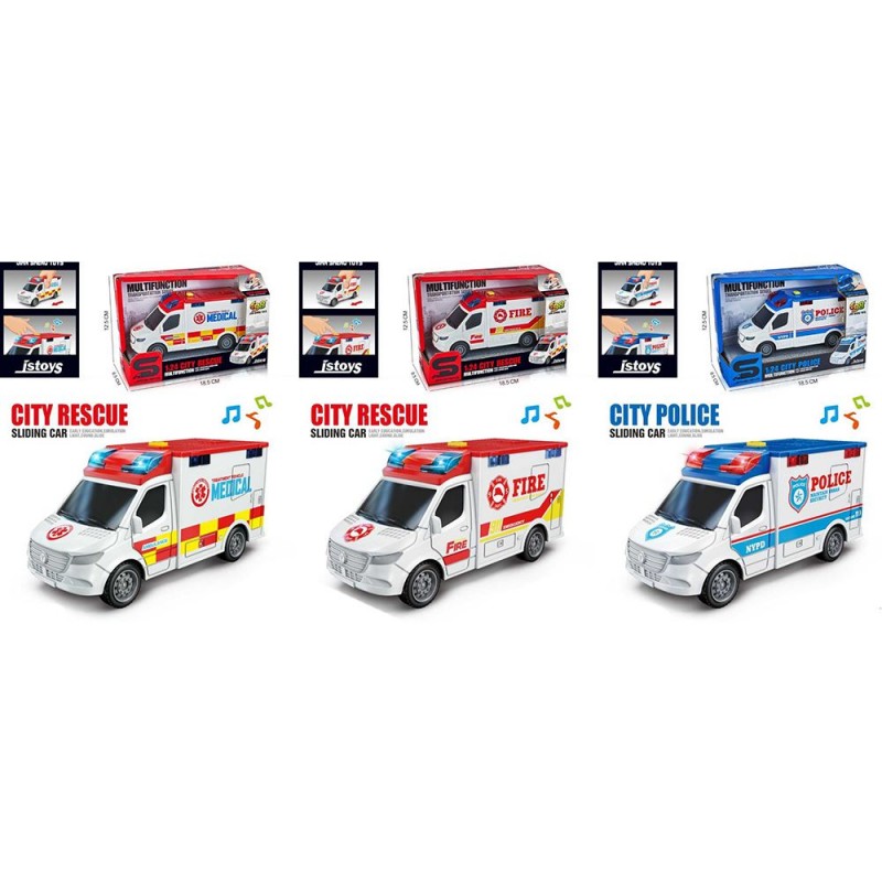Транспорт спецслужб JS221-21B-21A (36шт) інерц, 1:24, звук, світло, 3 види (поліція, швидка допомога, пожежна), бат(табл), в кор-ці, 18,5-12,5-8,5см
