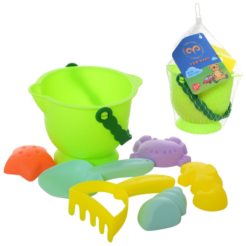 Набір для пісочниці 680 відерце, лопатка, граблі, формочки, сітка, 16-16-16 см.