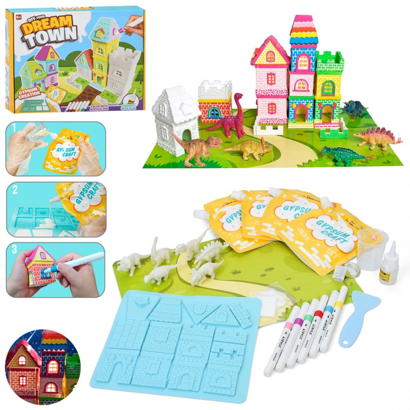 Набір для творчості I003 Місто мрій,побудуй будинок,світло,динозаври 6шт,гипс,формочки,інструм.,бат.